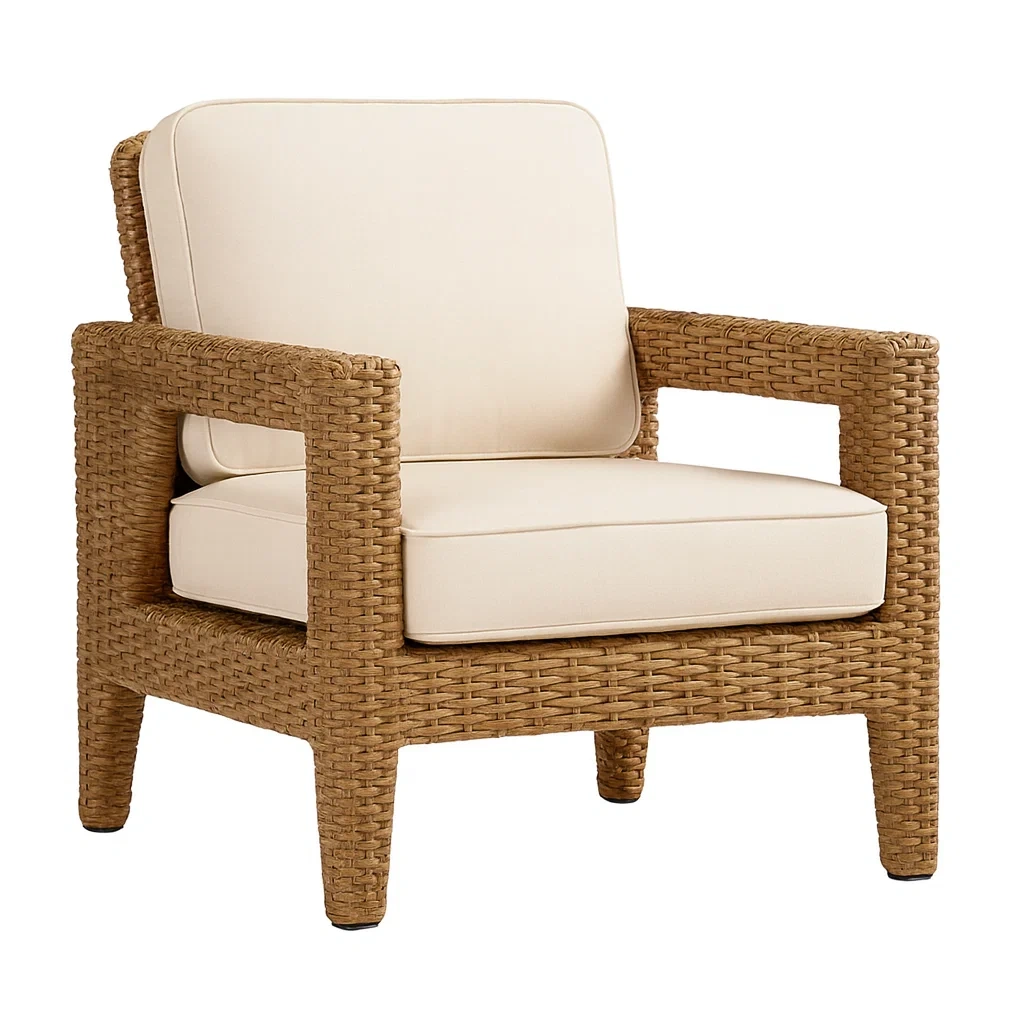 Fauteuil en bois et rotin avec coussins en polyester crème